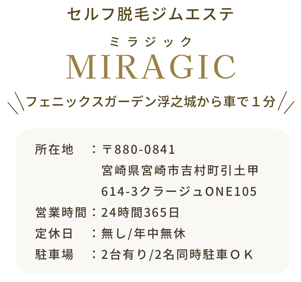 MIRAGIC 2023.03.12 体験ご予約はコチラ 体験ご予約はコチラ 体験ご予約はコチラ 拡大地図を表示する 宮崎市/浮之城/柳丸/セルフ脱毛サロン/セルフジム/セルフエステサロン/MIRAGICミラジック Copyright ©︎ MIRAGIC All Rights Reserved